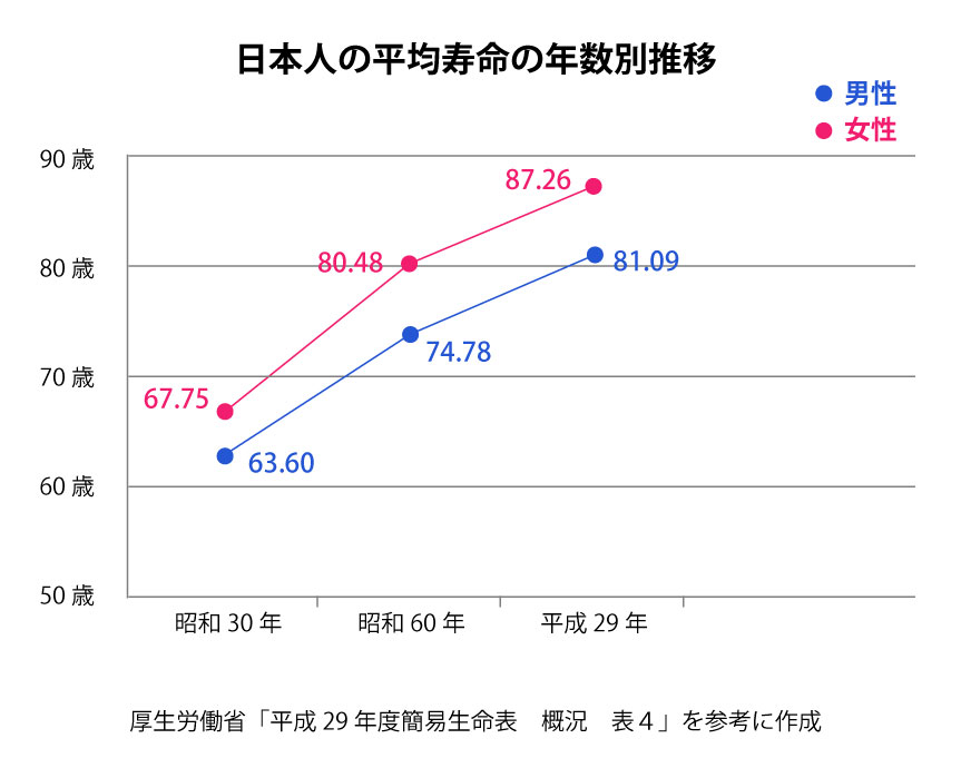昭和の後半にはすでに人生80年時代が予想されていましたが、平成が終わる現在、人生100年時代が予想されています。下の表を見てみても、平均寿命は確実に伸びています。